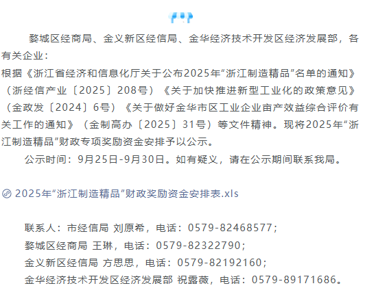 婺城區(qū)經(jīng)商局、金義新區(qū)經(jīng)信局、金華經(jīng)濟(jì)技術(shù)開發(fā)區(qū)經(jīng)濟(jì)發(fā)展部,各有關(guān)企業(yè):根據(jù)《浙江省經(jīng)濟(jì)和信息化廳關(guān)于公布2025年“浙江制造精品”名單的通知》(...