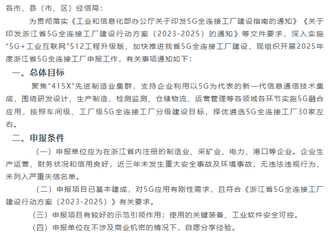 各市、縣(市、區(qū))經(jīng)信局: 為貫徹落實(shí)《工業(yè)和信息化部辦公廳關(guān)于印發(fā)5G全連接工廠建設(shè)指南的通知》《關(guān)于印發(fā)浙江省5G全連接工廠建設(shè)行動(dòng)方案(20...